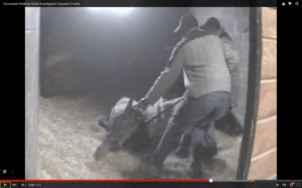 The following video is heartbreaking evidence of the systematic abuse of Tennessee walking horses, not only in the form of “soring” but also from physically aggressive abuse. The horses are defenseless and in unbearable pain.