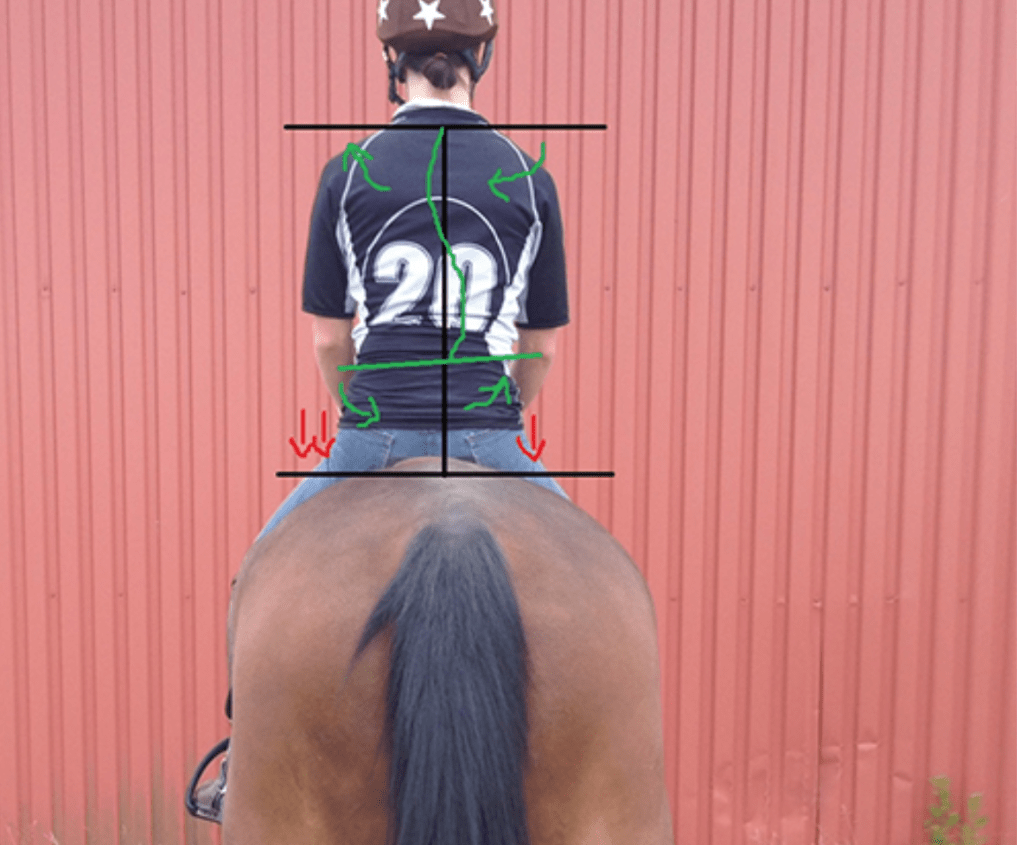 En forkorting av QL- muskelen på høyre side resulterer i ujevn vektfordeling gjennom setebeina med mer vekt gjennom venstre hofte, og har derfor en direkte effekt på rytterens hjelpere: Mer effektiv høyre sjenkel. Et skjevt bekken medfører videre en kollaps av rytterens høyre side og rotasjon av skuldrene, samt utvikling av skjev ryggkolonne, som bilde 1 under viser.