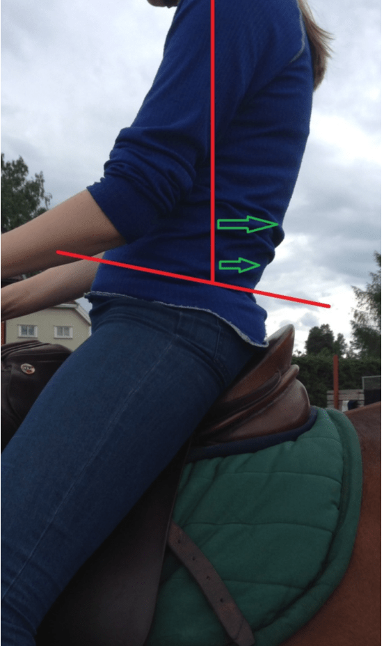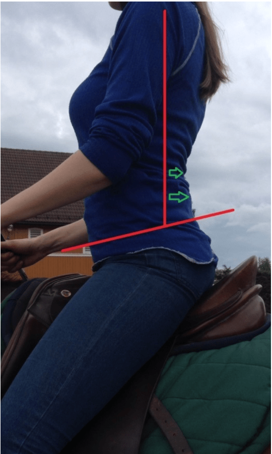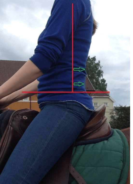 Det er lett å identifisere de rytterne som er mest utsatt for korsryggsmerter ved å se på posisjonen på bekkenet når de sitter i salen. Den lumbosakrale vinkelen (hoftevinkelen) er avgjørende for å oppnå balansert ridning og unngåelse av korsryggsmerter. I den normale rettoppstående posisjon er vinkelen ca. 30 grader, ryggen ser flat ut og de vertikale kreftene er absorbert gjennom fassettledd, mellomvirvelskivene i ryggraden, og støttende muskulatur (bilde 2).