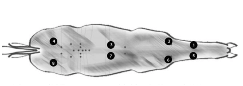 | 4,8 | Mid-point between the cranial aspect of the tuber sacral and tuber coxae (middle gluteal muscle) |
