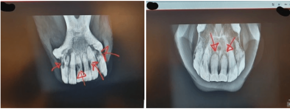 Sykdommen gir også karakteristiske røntgenfunn, der tannrøttene ser “oppspiste” ut og det har utviklet seg store påleiringer av tannsement.